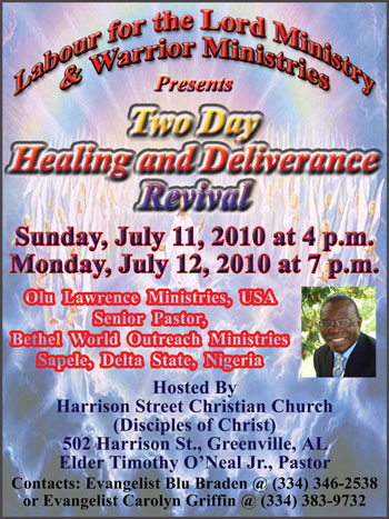 p.m. at Harrison St. Christian Church. The event is sponsored by Labour for the Lord Ministries and Warrior Ministries.